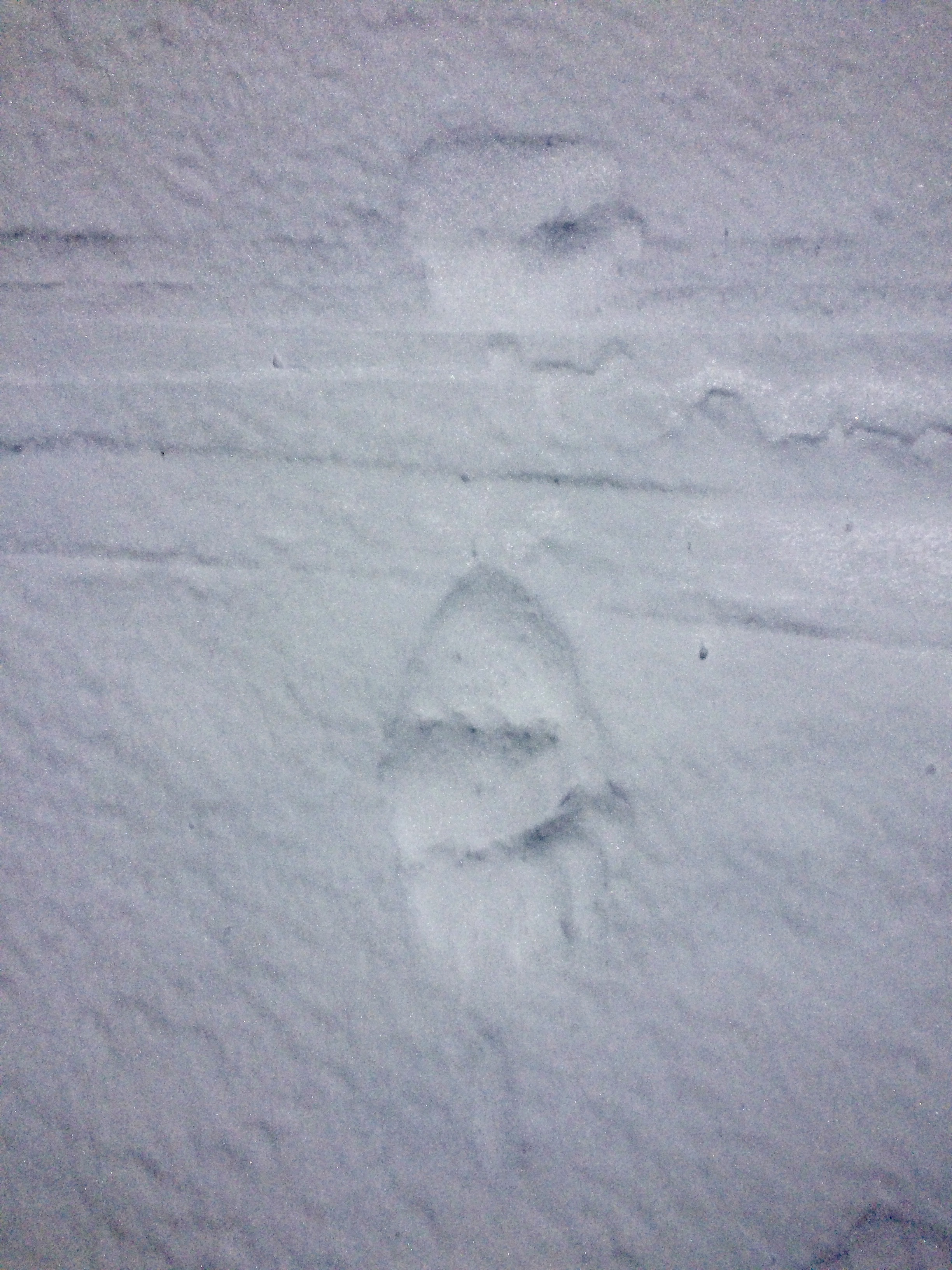 Almost back to the truck, Diane and I crossed grizzly bear tracks. We stopped, exclaimed, photographed. Then I found our earlier tracks. The grizzly prints imprinted over our original outgoing tracks, meaning it had passed this way between the time we left the truck and the time we returned. We paused, breathed and looked around.