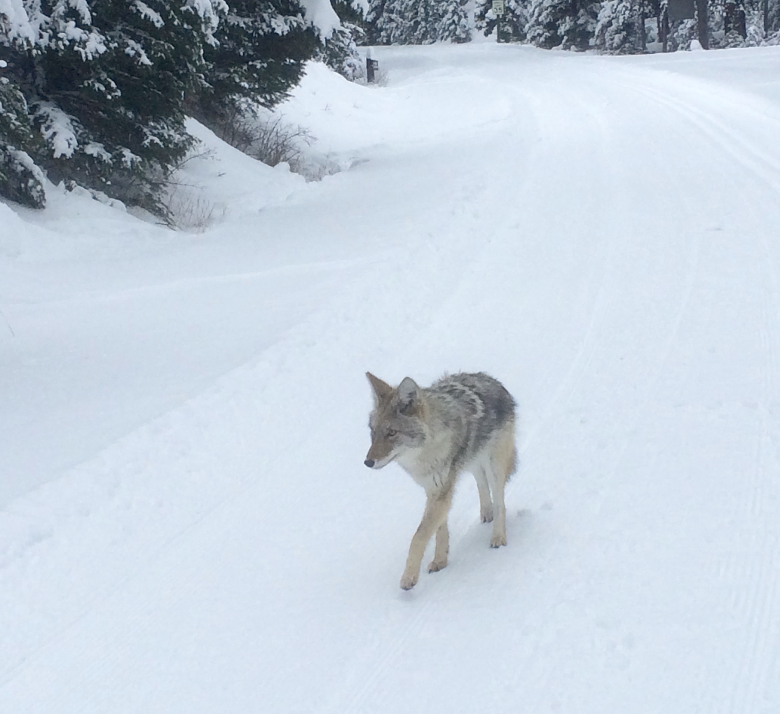 I stop to drink it all in. The coyote looks large: well-fed and fluffy. I ski to his rectangular four-toed tracks while keeping one eye on the bison ahead. I watch the bison for a while and decide to give a particularly large bull a wide berth by skiing off trail. As I carefully slide by, he lifts his head and looks at me. I gently say ‘Hey Buddy, it’s ok’. He takes me at my word and goes back to grazing.