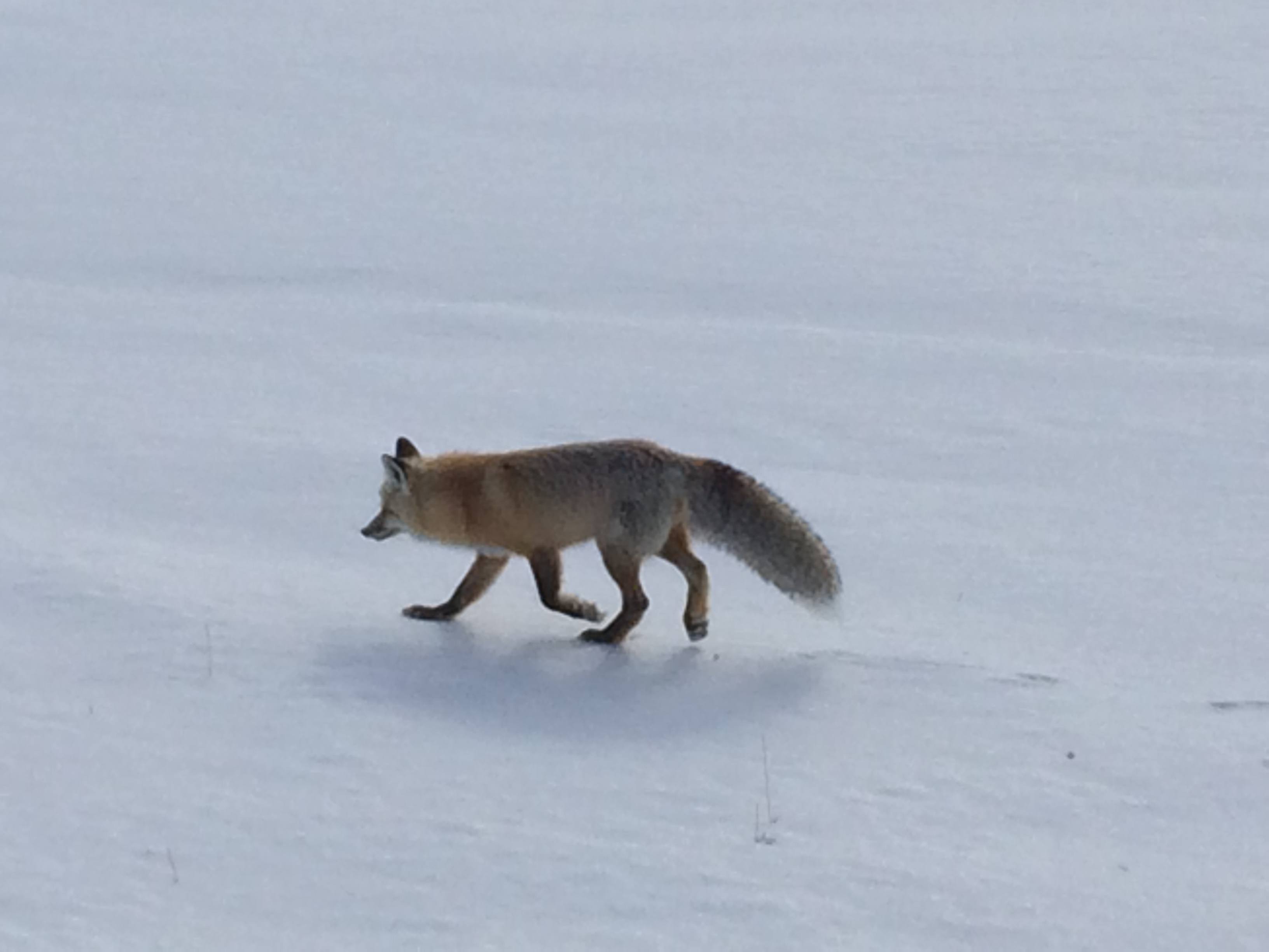 A half mile later a movement catches my eye: this time instead of grey I see red: a red body, black legs, a pointed nose and a very fluffy tail. One of the most beautiful foxes I’ve ever seen stands in the trail facing me. He sees me but does not seem at all concerned. Slowly he angles up the hill, pausing to look back as if waiting for a friend to come along. I warn him of the coyote ahead but he does not take heed.
