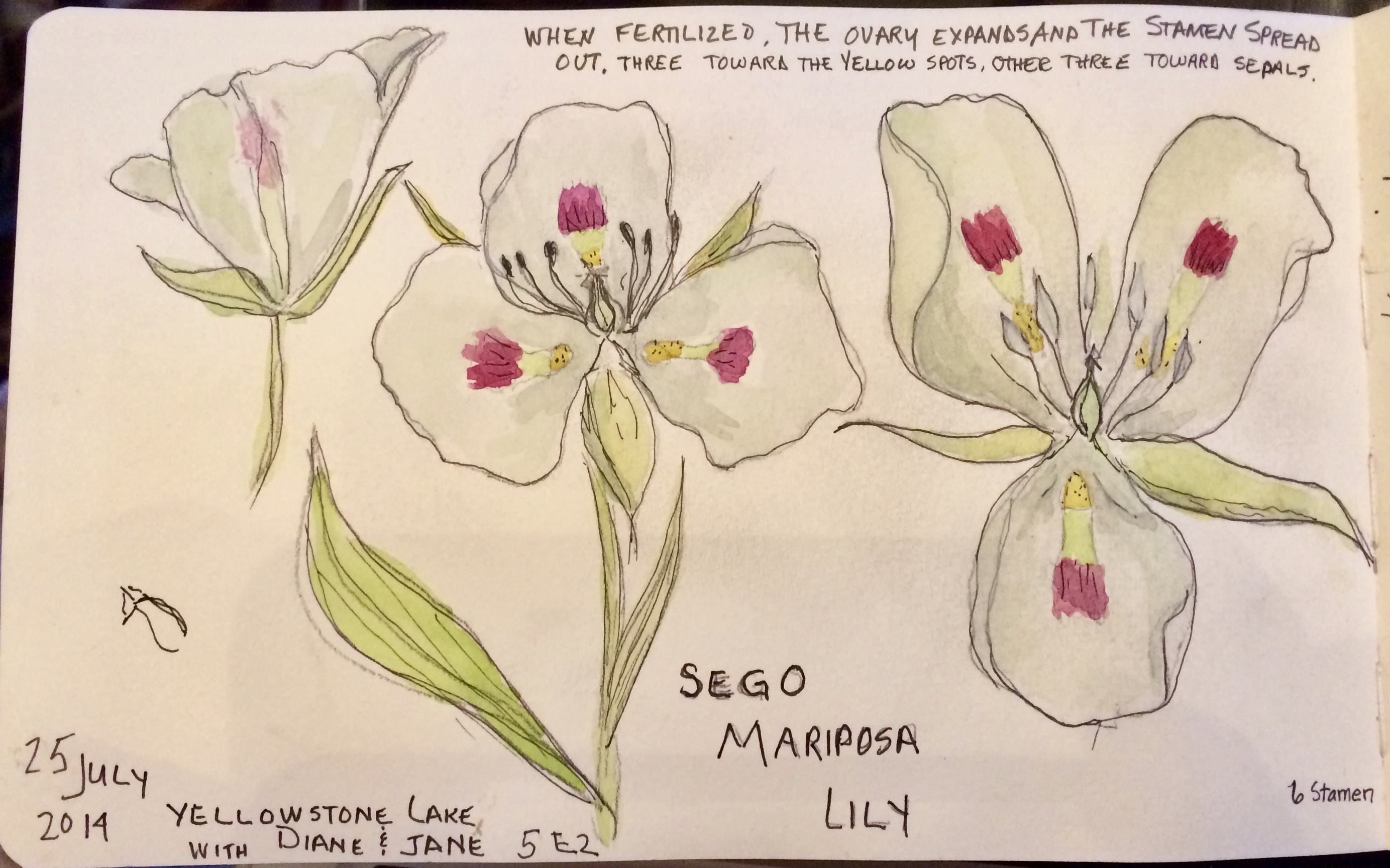 Yellowstone Lake: Kayak trip with Jane and Diane. High waves and coming into shore trying to avoid rocks. Laughing so hard we cried.  Hiking through more Sego/Mariposa Lilies than we’ve ever seen. Stopping to photograph and just look.  My first close look at these flowers, recording what I learned from observation.