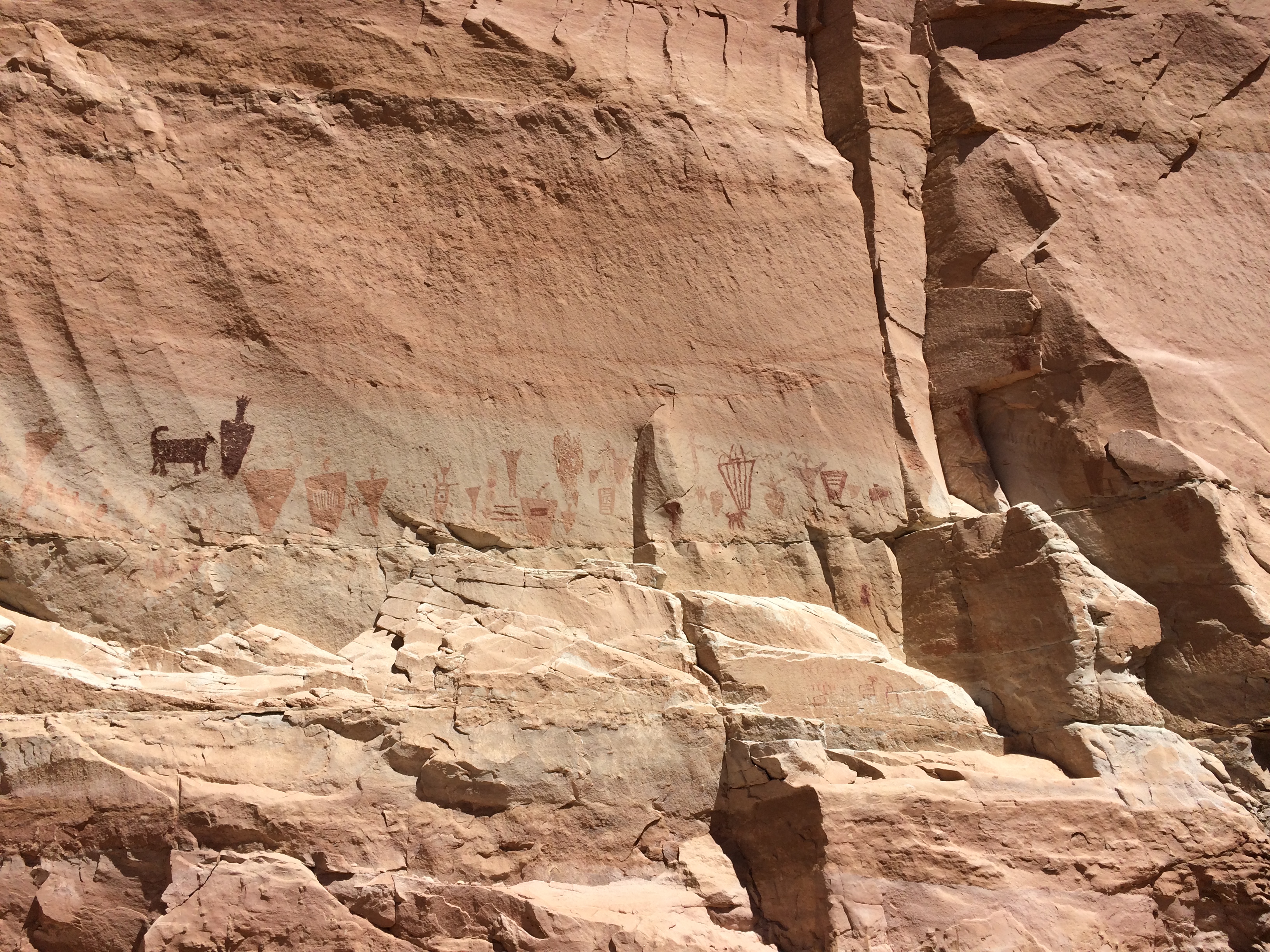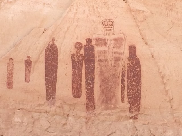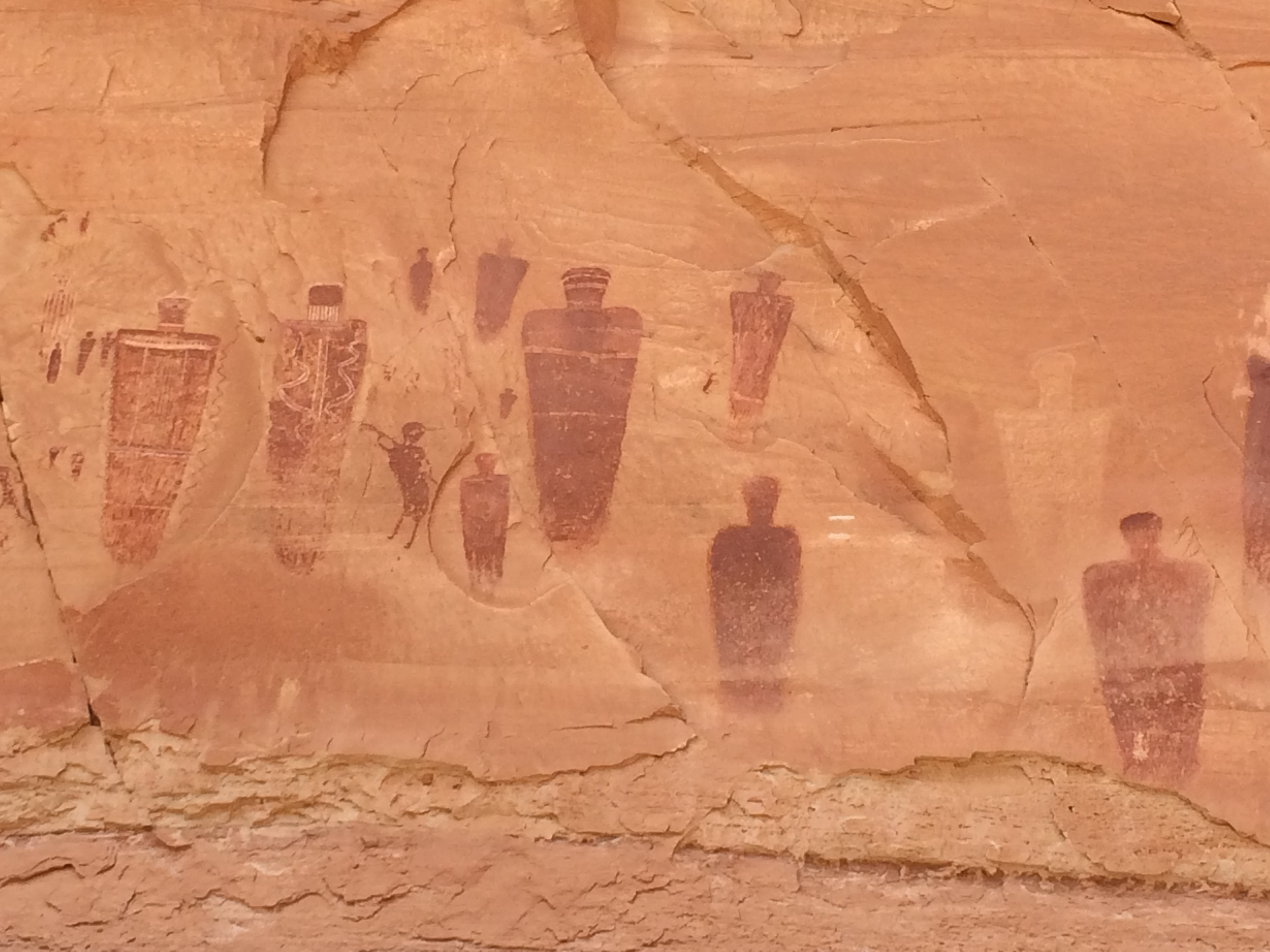 The Great Gallery shared its beauty with me if not its secrets. Sitting, staring and drawing for a week has etched the figures into my psyche, and I think of the people who created them. Nomads, moving through these canyons each year following ripening seeds and fruit, hunting bighorn sheep, rabbits, deer, leaving only charcoal from cooking fires from brief stops in each place. I wonder…. I wonder who they were, how they thought, what they enjoyed, what songs they sang, what language they spoke. If they were anything like today’s nomadic tribes in Australia and South Africa, they may have travelled many miles a year. The Barrier Canyon pictograph style, which is found from the Grand Canyon through Utah and into Northern Colorado, suggests they did just that. They would not have had nor valued many possessions, and they may have only ‘worked’ a few hours a day, having more free time than most of us do in modern society. These panels are evidence of having survival needs met and having the leisure time to create art. Are these spiritual figures? Figures of deceased individuals ascending to the afterlife or hovering above and behind the living? Are they prayers for successful hunts? Are they telling the news of who went before? We will never know, and it may be presumptuous of us to try to decipher them. The week spent with the Great Gallery figures allows me to just appreciate them and accept their mystery.