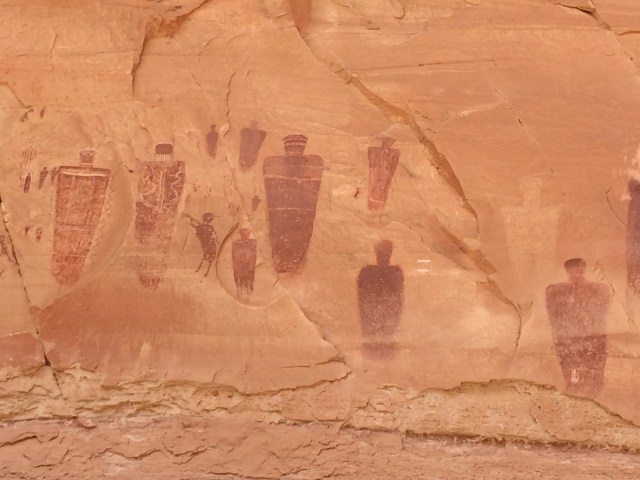 There are four panels in Horseshoe Canyon: High, Shelter, Alcove, and the Great Gallery. Most of the figures are of the Barrier Canyon style—life-size figures with no arms or legs, but often with designs in the torso. (There is one set of more recent figures, which includes a hunting scene.) Research has shown that the panels are placed where canyon acoustics have specific similar qualities. (I find this intriguing—did they have flutes? Drums? Did they use their voices? Clap hands…?)