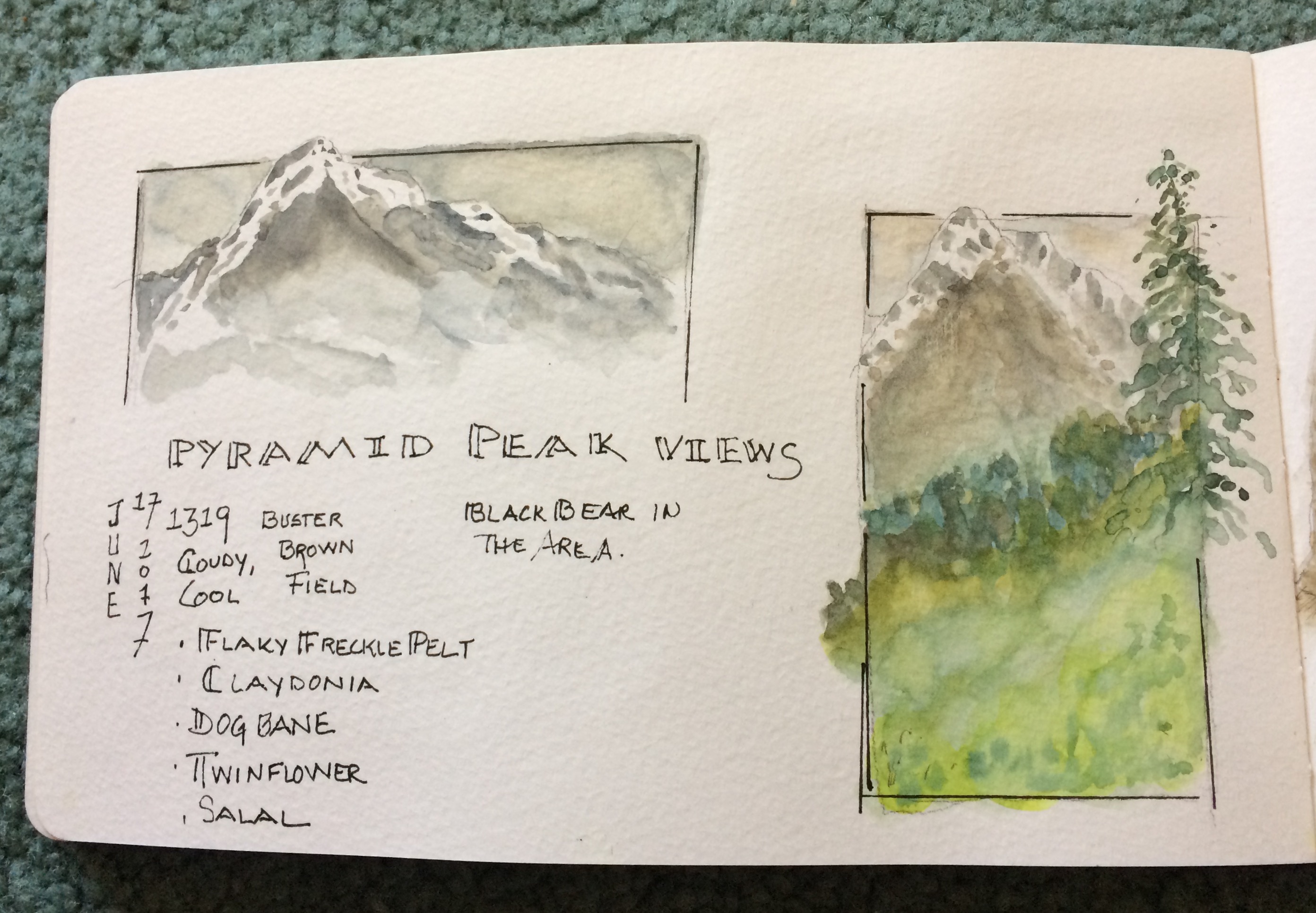We were inspired to paint Pyramid Peak. Rocks, flowers and a host of other natural items added pages of color to our journals. Michele Cooper is an excellent instructor, showing multiple examples and giving specific brush and color mixing techniques. It will take time to integrate all that I learned. Drawing and painting in a new environment can be challenging: different color mixes and different tones mean re-thinking previous palettes. The weather was cool and somewhat rainy and misty. How to get that mysterious feeling into a quick vignette?