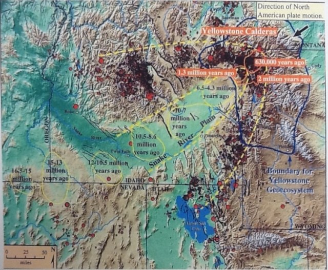So… here is part of the Yellowstone Geology story: 630,000 years ago…. No, let’s go back further. Let’s go back about 17 million years. About that time, a plume of hot magma that today we call the Yellowstone Hotspot first poked through the North American Plate, erupting as a volcano along the Oregon/Nevada border.