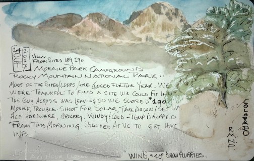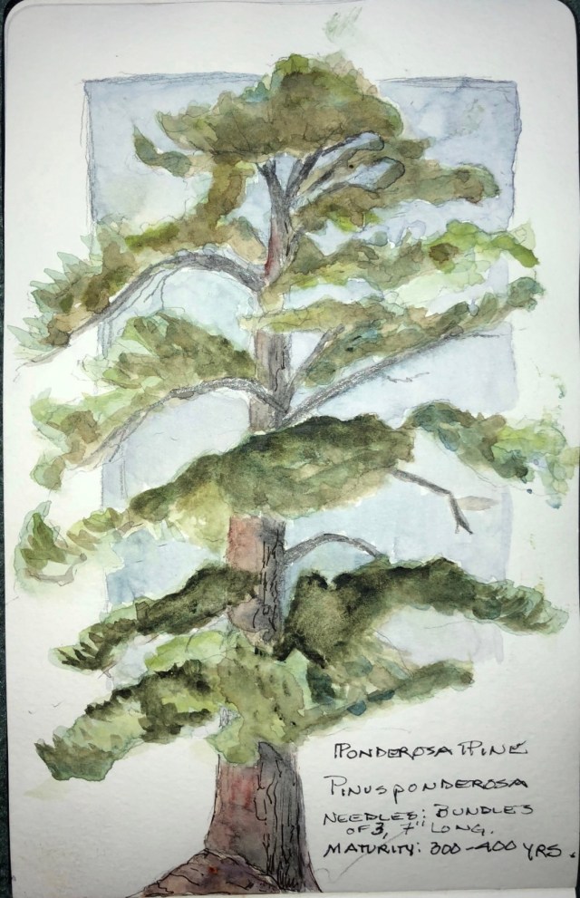 I remember throwing on hat, mittens and my warmest puffy down jacket, stepping outside, grabbing my chair to sit and watch the early morning sunlight play over Longs Peak. Memories upon memories: I sat thinking about two attempts to summit Longs Peak years ago. Hiking alone, starting before dawn, making it to The Keyhole each time, then being turned back by black ice or thunder clouds. This trip’s memories play as I look at the ponderosa pine I drew, remembering the difficulty breathing at high altitude while climbing steep rocky trails to The Lock and Lake Haiyaha. Stellar’s Jays often flit between trees especially near a waterfall or lake. I rarely see them here in Yellowstone, but in RMNP they were a daily sight. I remember Fred calling me back to see three moose cross the trail behind us, and I remember another hike: a bugling bull elk herded his harem across the trail and up the hill in front of us.
