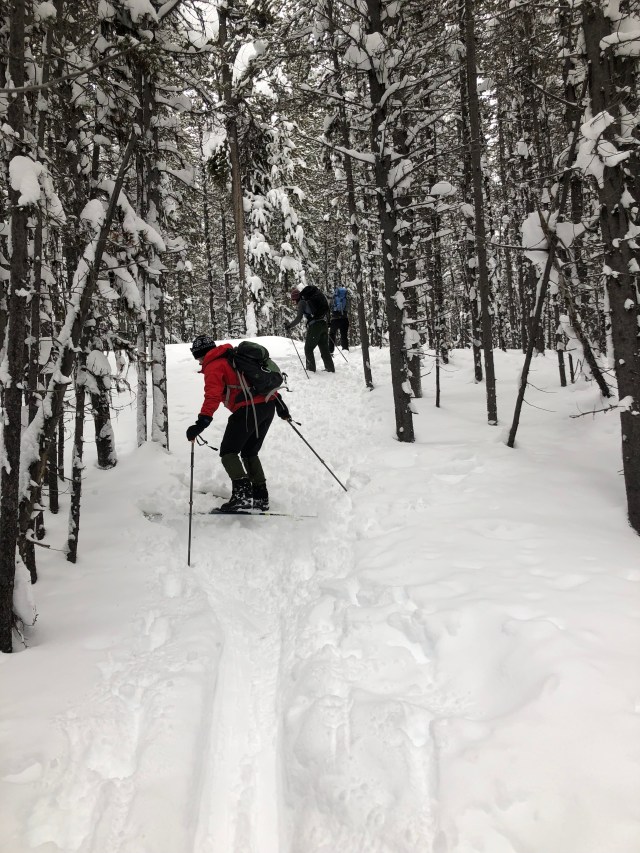 “Hey Jane! Stop right there for a photo-op!” Jane obliges and I get a photo of her in her orange jacket surrounded by snow-covered trees. We are somewhere along the Republic Trail, outside of Cooke City, Montana. Jane and Patty led the way up the track to the abandoned Erma Mine followed by Diane and me. We then continued up into the trees of the lower flanks of Republic Peak. It has been dumping snow for 3 days now and yesterday afternoon’s tracks have been obliterated. We decide to stay low along the creek and are moving slowly, breaking trail through knee-deep powder. The snow covers our hats, backpacks, mittens—worse than sand at a beach, this white stuff gets everywhere. But our smiles are huge as we look around taking in the scene. The surrounding mountains are invisible in the curtain of snow. Snow piles like ice cream overloading a cone on branches and tall stumps. We comment that we would not want to get hit with a falling pile–the weight alone could cause a concussion! We switch places often. The leader gets hot and breathless, while those in back get cold from moving slowly. Switching often keeps us all more comfortable. We decide to head back to town and turn and begin our cruise back on the broken trail. WooHoo! Echoes down canyon as we slide through spruce and fir. Upon return, we take a quick selfie then hop into the car to warm up on the ride home.