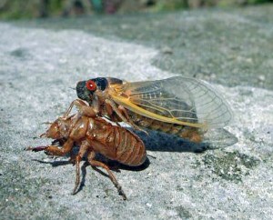 The adult periodical cicada emerges from its 17-year nymph stage, molts and arises as a winged adult. This spring will see the return of the large, colorful, fly-like bugs with large eyes and tented wings. (Bob Rabaglia/U.S. Forest Service)